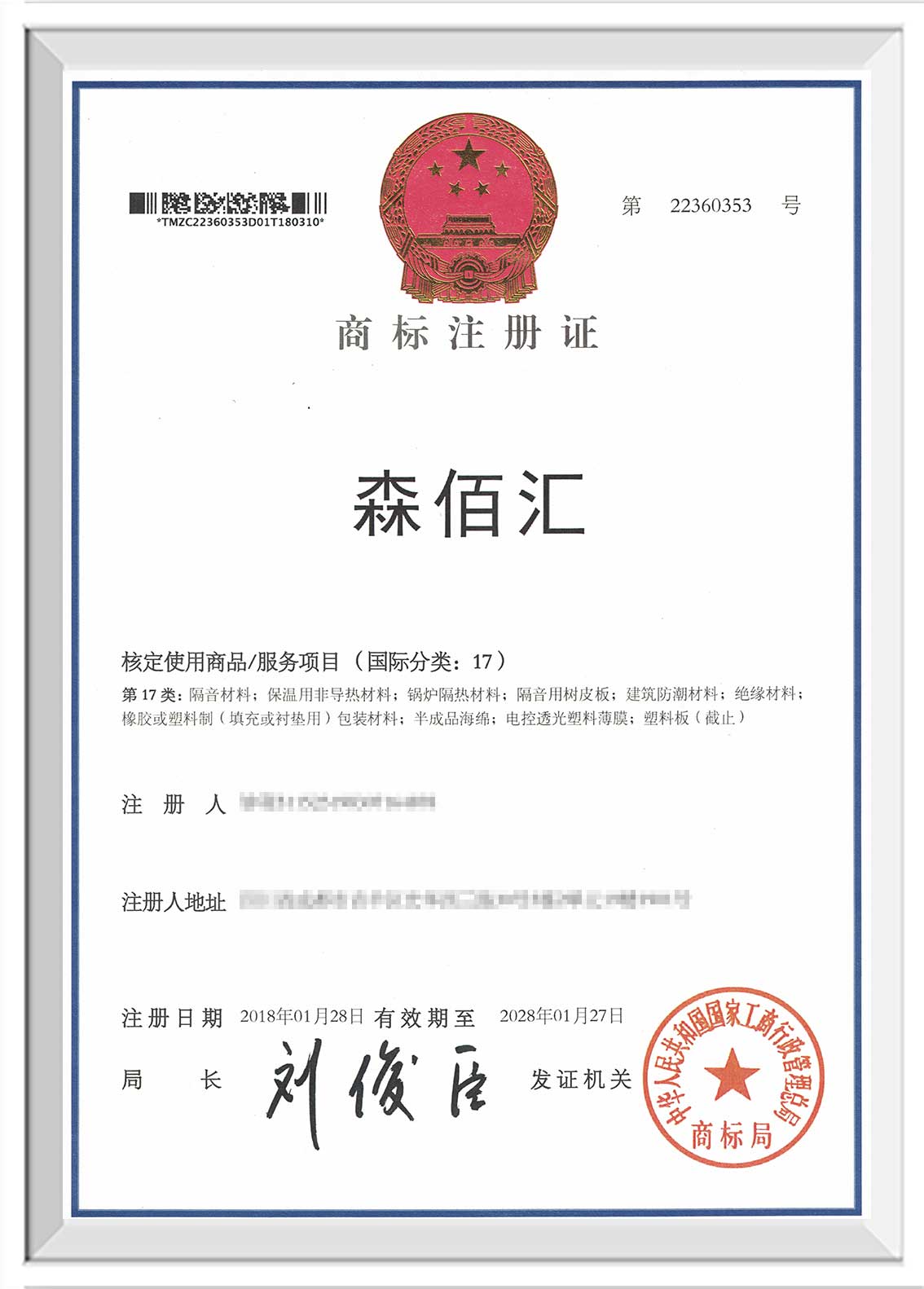 福州“森佰汇”商标证书下发至企业